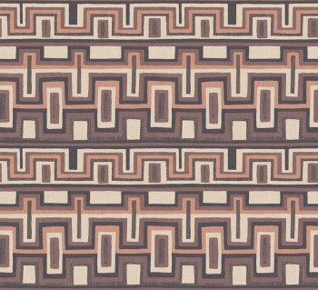 Non-woven wallpaper, delicately embossed graphic ethno pattern in shades of black, brown, ocher, sometimes with gold accents.