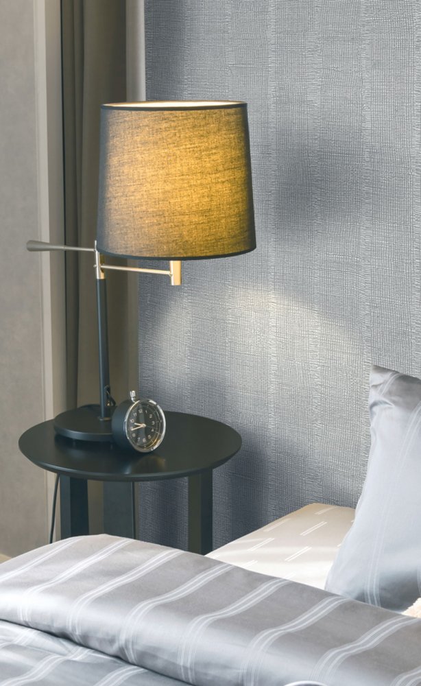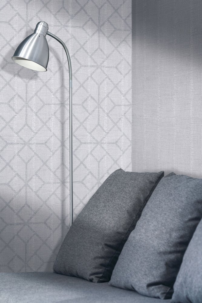 Coarse fabric design with an irregular texture, which creates stripes. In gray shades. Non-woven backing, vinyl surface.