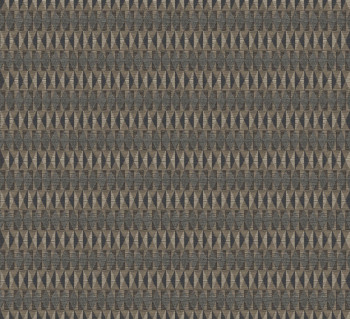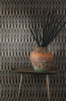 Non-woven wallpaper, delicately embossed ethno patterns, shades of brown, black, sometimes semi-glossy gold accents.