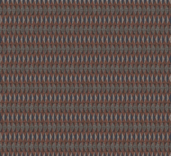 Non-woven wallpaper, delicately embossed ethno patterns, shades of brown, blue and black, with semi-glossy silver accents in places.