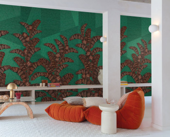 Non-woven wall mural, background evoking coarser textile and lines forming an ethno pattern of leaves, shades of green, brown, brick red.