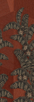 Non-woven wall mural, background evoking coarser textile and lines forming an ethno pattern of leaves, shades of brick red and brown.