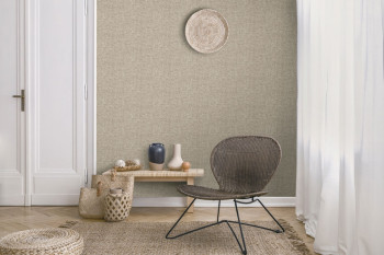 Coarse fabric design, brown-gray melange, metallic semi-gloss. Non-woven backing, vinyl surface.