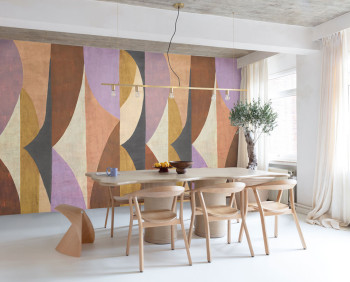 Non-woven wall mural, subtly embossed, graphic patterns, shades of purple, brown, ochre and beige.
