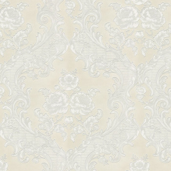 Luxury non-woven wallpaper with vinyl surface, semi-gloss pearl white background, cream baroque pattern.