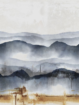 Non-woven wallpaper, horizon view motif, shades of grey-blue and brown.