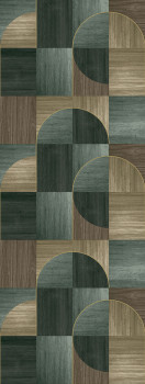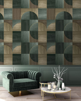 Geometric non-woven wallpaper, shades of green and brown, evokes wooden wall panelling.