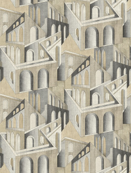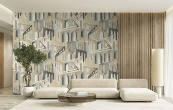 Graphic non-woven wallpaper, shades of grey and beige, architectural design.