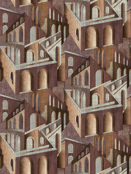 Graphic non-woven wallpaper, shades of burgundy and brown, architectural design.