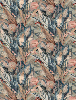 Non-woven wallpaper, leaves in shades of blue, brown, pink and grey.