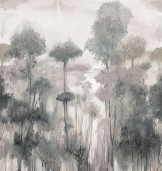 Non-woven wallpaper, forest, tree motif, shades of grey and beige.
