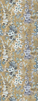 Non-woven wallpaper, floral motifs, shades of brown, blue, grey.