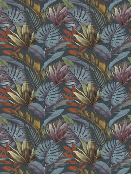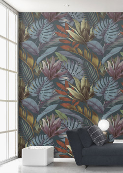 Non-woven wallpaper, tropical leaves in shades of blue, purple, green and brown.