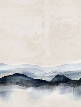 Non-woven wallpaper, horizon view motif, shades of blue, grey.