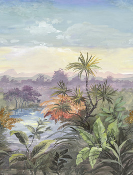 Non-woven wallpaper, landscape with palm trees and tropical leaves, shades of green, blue, purple and ochre.