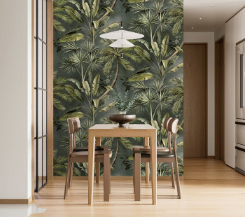 Non-woven wallpaper, palm trees and tropical leaves, shades of grey and green.