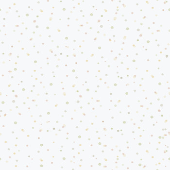 Non-woven wallpaper, motifs of colored dots / specks in shades of green, pink, gray-beige and yellow, texture of very fine fabric.
