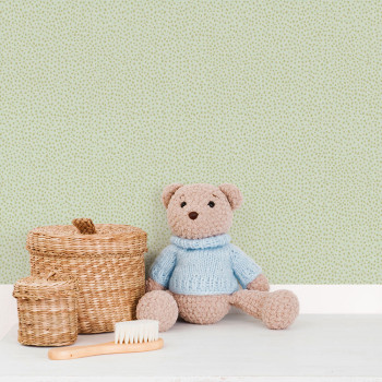 Green non-woven wallpaper, motif of drops, spots, texture of very fine fabric.
