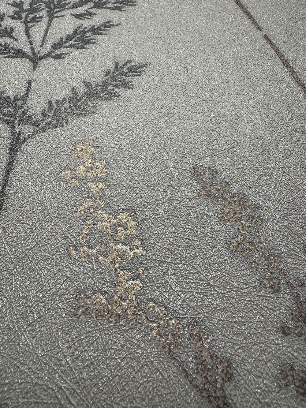 Non-woven wallpaper with vinyl surface, pattern of meadow flowers and grasses in shades of semi-gloss brown and brown-grey-gold - fine fibrous texture.