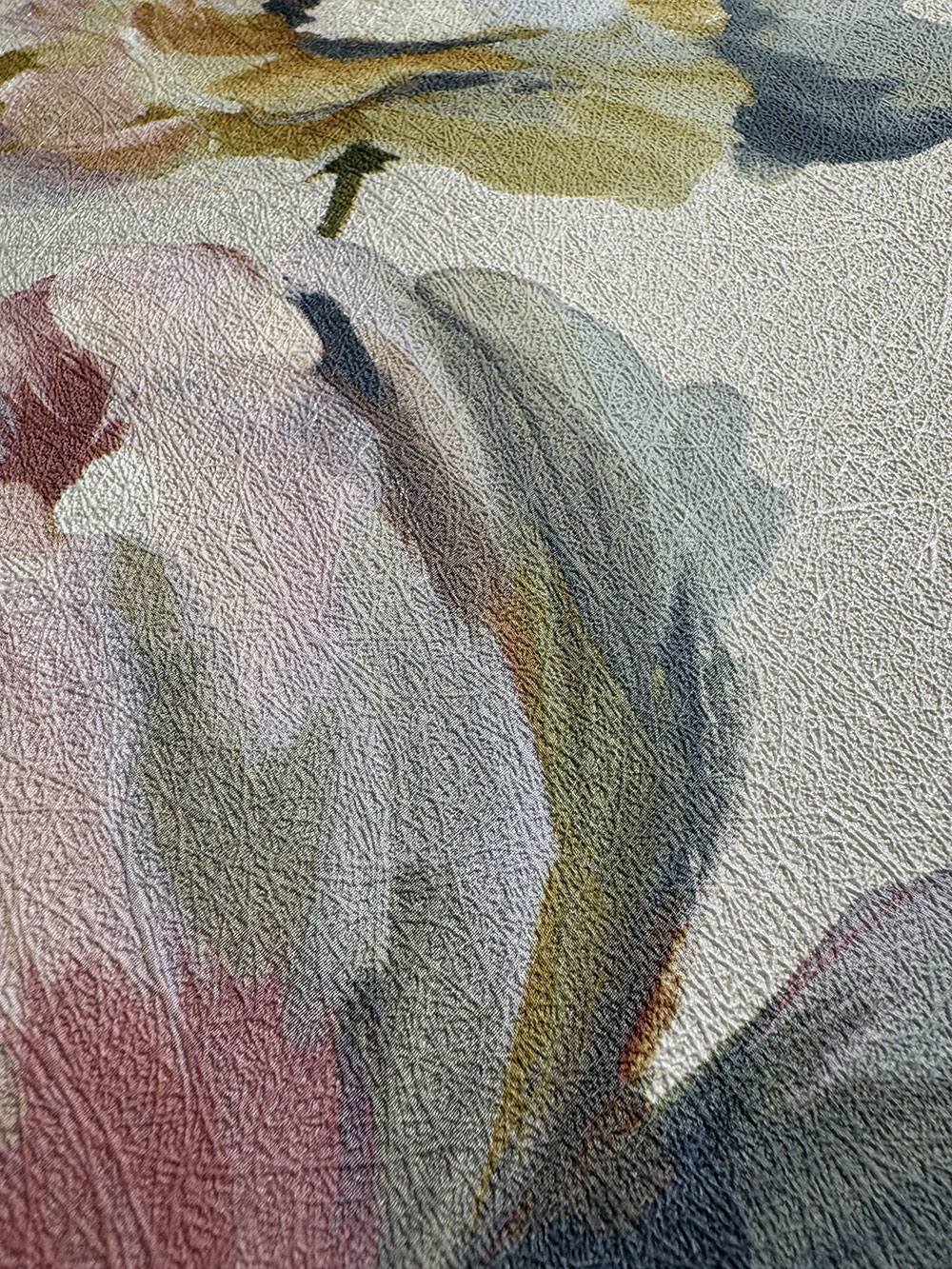 Non-woven wallpaper with vinyl surface, floral pattern in shades of gray, pink, green, blue and purple - fine fibrous texture.