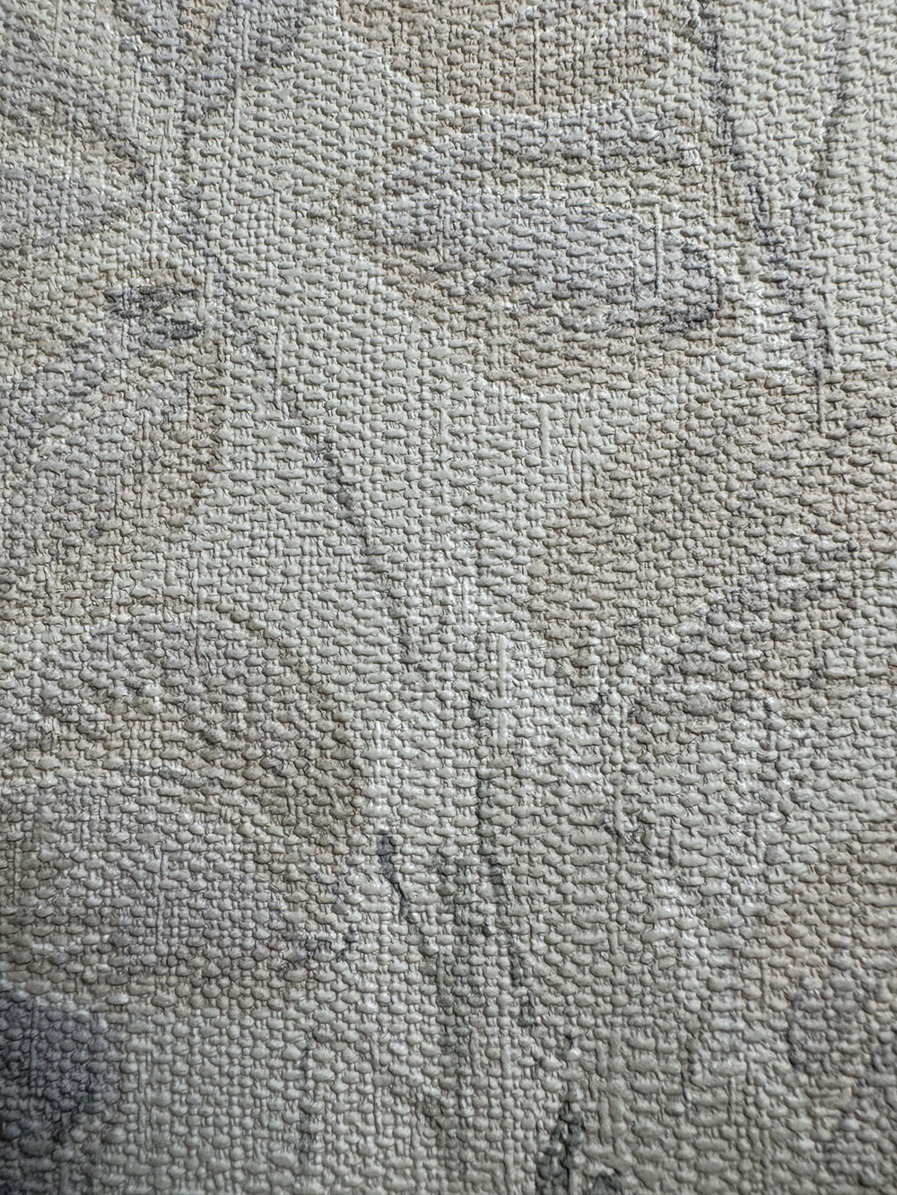 Non-woven wallpaper with vinyl surface, imitation of coarser fabric, leaf motifs in shades of green and gray-beige.