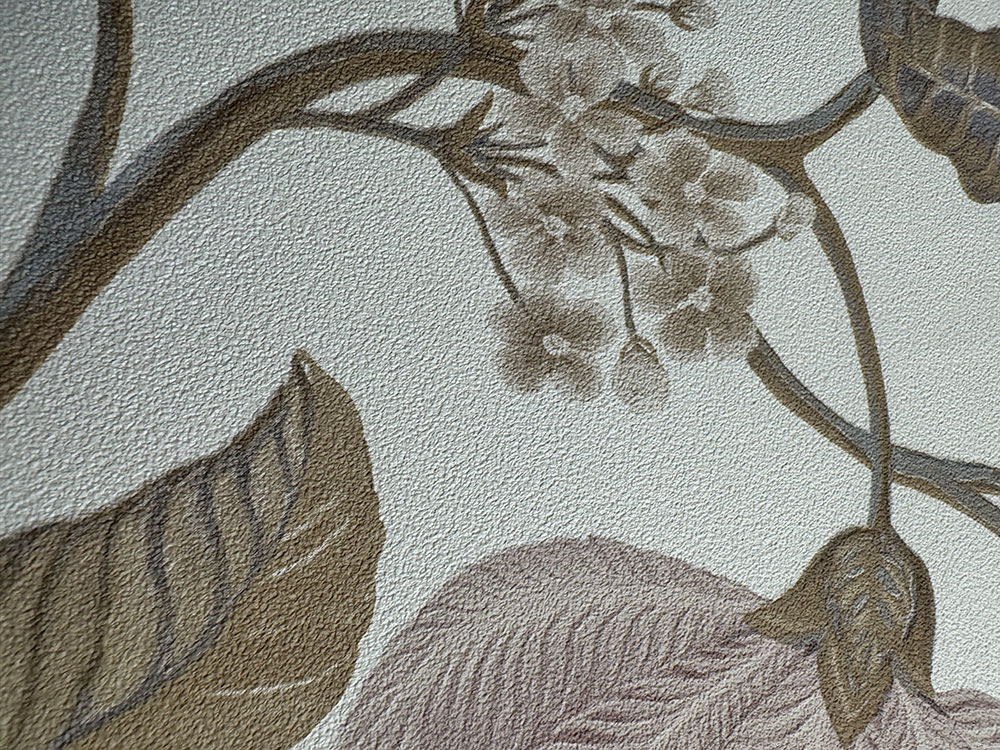 Non-woven wallpaper with vinyl surface, cream background, flowers in shades of beige, brown, gray and pink.