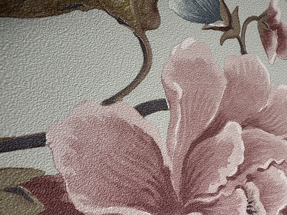 Non-woven wallpaper with vinyl surface, beige background, flowers in shades of pink, brown and gray-blue.