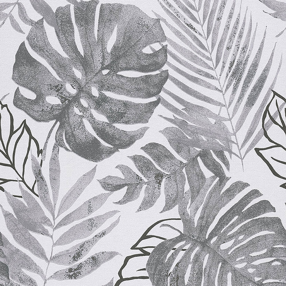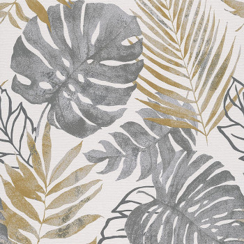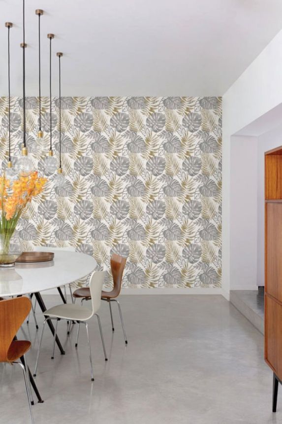 Natural and plant motifs make every interior more pleasant and cosier. Large palm leaves and ceriman leaves in gray shades on a gray-white background. Embossed non-woven wallpaper with a vinyl surface.
