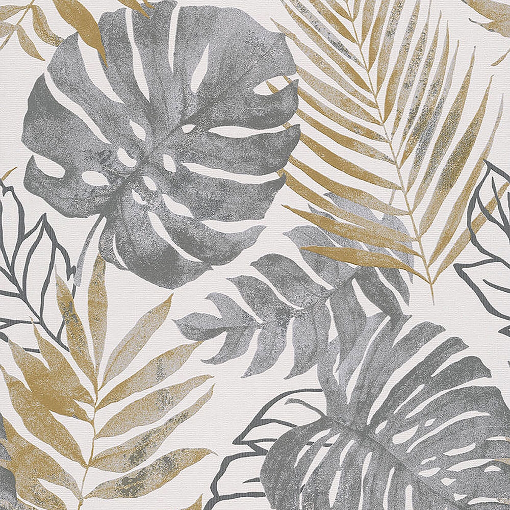 Large palm leaves and ceriman leaves in shades of gray and ocher on a creamy background.