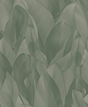 Distinctly embossed non-woven wallpaper with vinyl surface, leaf motif in shades of green.