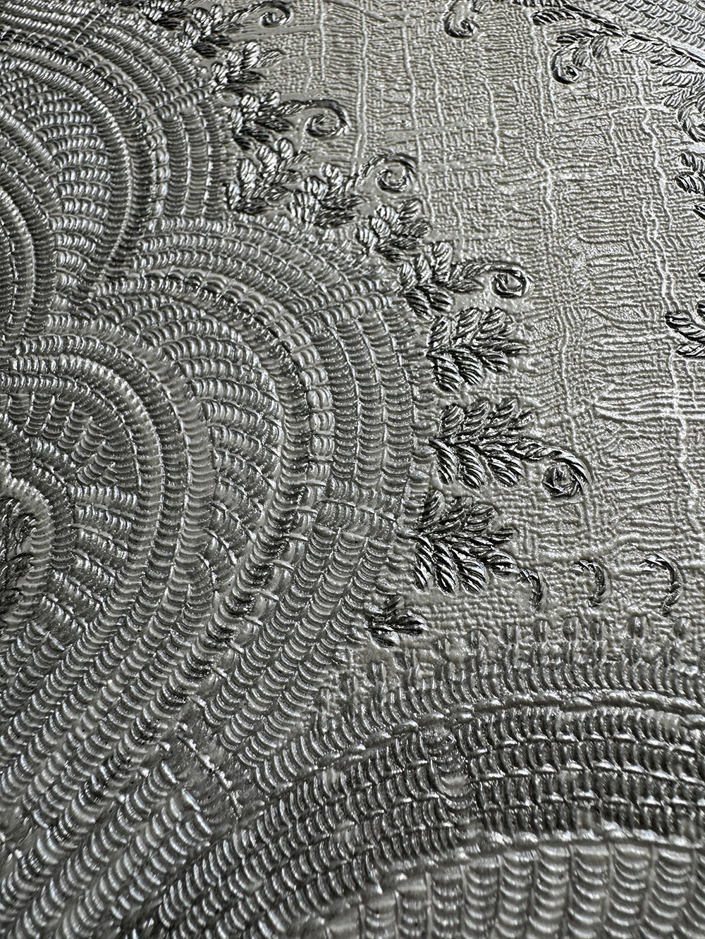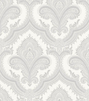 Luxury non-woven wallpaper with vinyl surface, baroque pattern in white and grey-silver.
