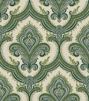 Luxury non-woven wallpaper with vinyl surface, baroque pattern in shades of semi-gloss beige and green.