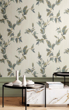 Wallpaper with a vinyl surface, cream striped background with leaf motifs in semi-gloss blue, green, and brown shades.