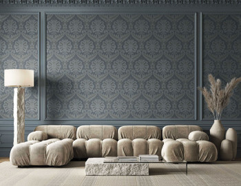 Wallpaper with a vinyl surface, shades of blue and brown, palace-style damask pattern, fabric texture.