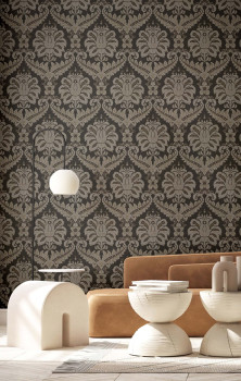Wallpaper with a vinyl surface, shades of black and grey, metallic gold details, palace-style damask pattern, fabric texture.
