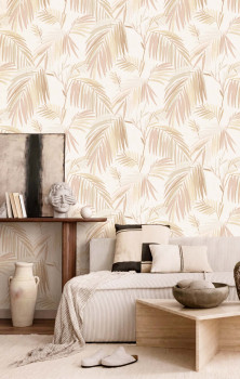 Luxury non-woven wallpaper, embossed semi-gloss palm leaves, shades of beige, ochre and dusty pink.