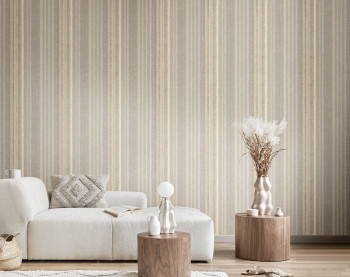 Luxury non-woven wallpaper for walls, fabric texture, stripes in shades of grey and beige with golden semi-gloss.