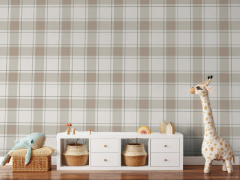 Wallpaper with a vinyl surface, imitation of checkered fabric in shades of grey and greige.
