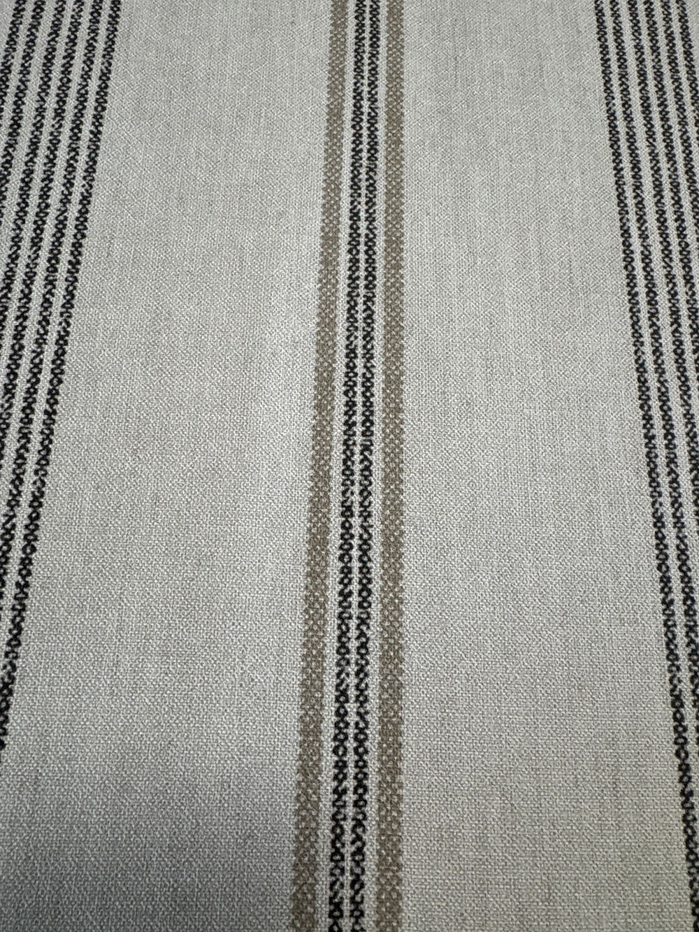 Wallpaper with a vinyl surface, imitation of striped fabric in shades of grey, black, and brown.