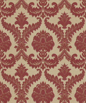 Non-woven wallpaper with vinyl surface, baroque damask pattern, shades of beige and burgundy, shades change according to the light.