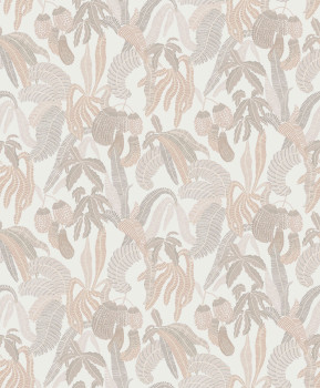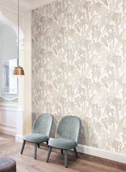 Cream white non-woven wallpaper, leaf pattern in shades of beige, alternating matte and metallic shine.