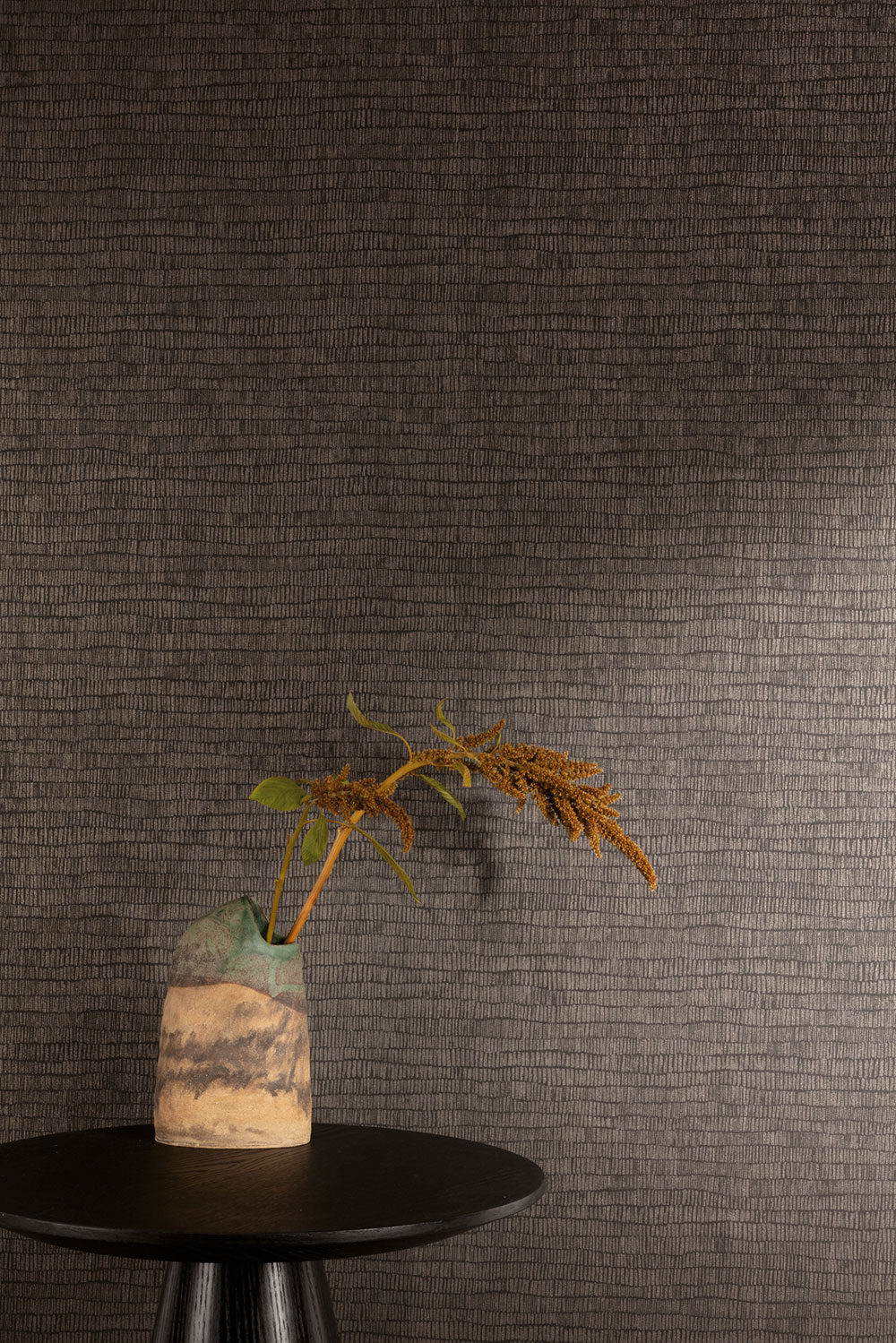 Non-woven wallpaper, line pattern forming irregular horizontal stripes - shades of brown, sometimes metallic semi-gloss.