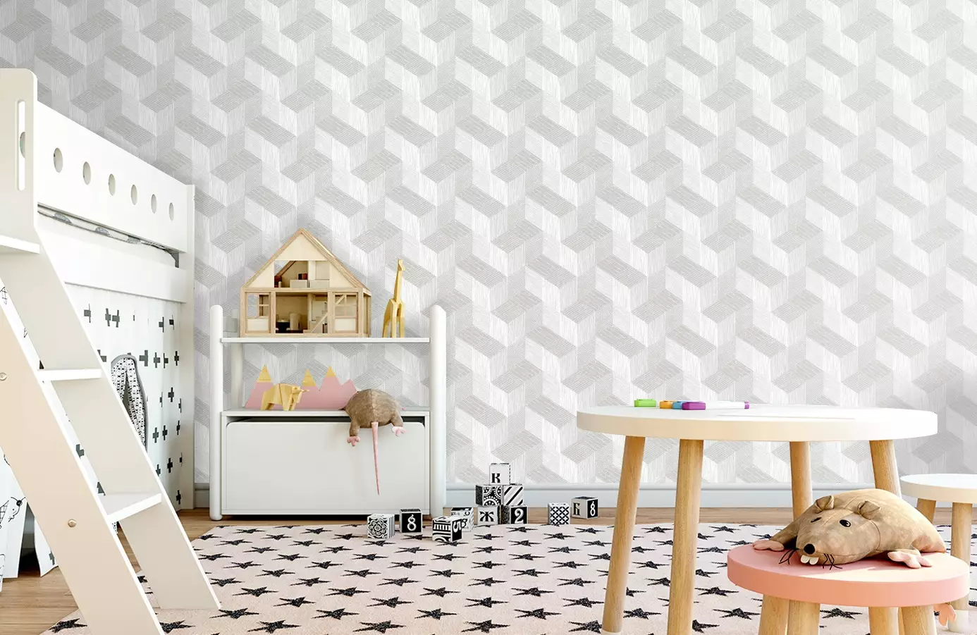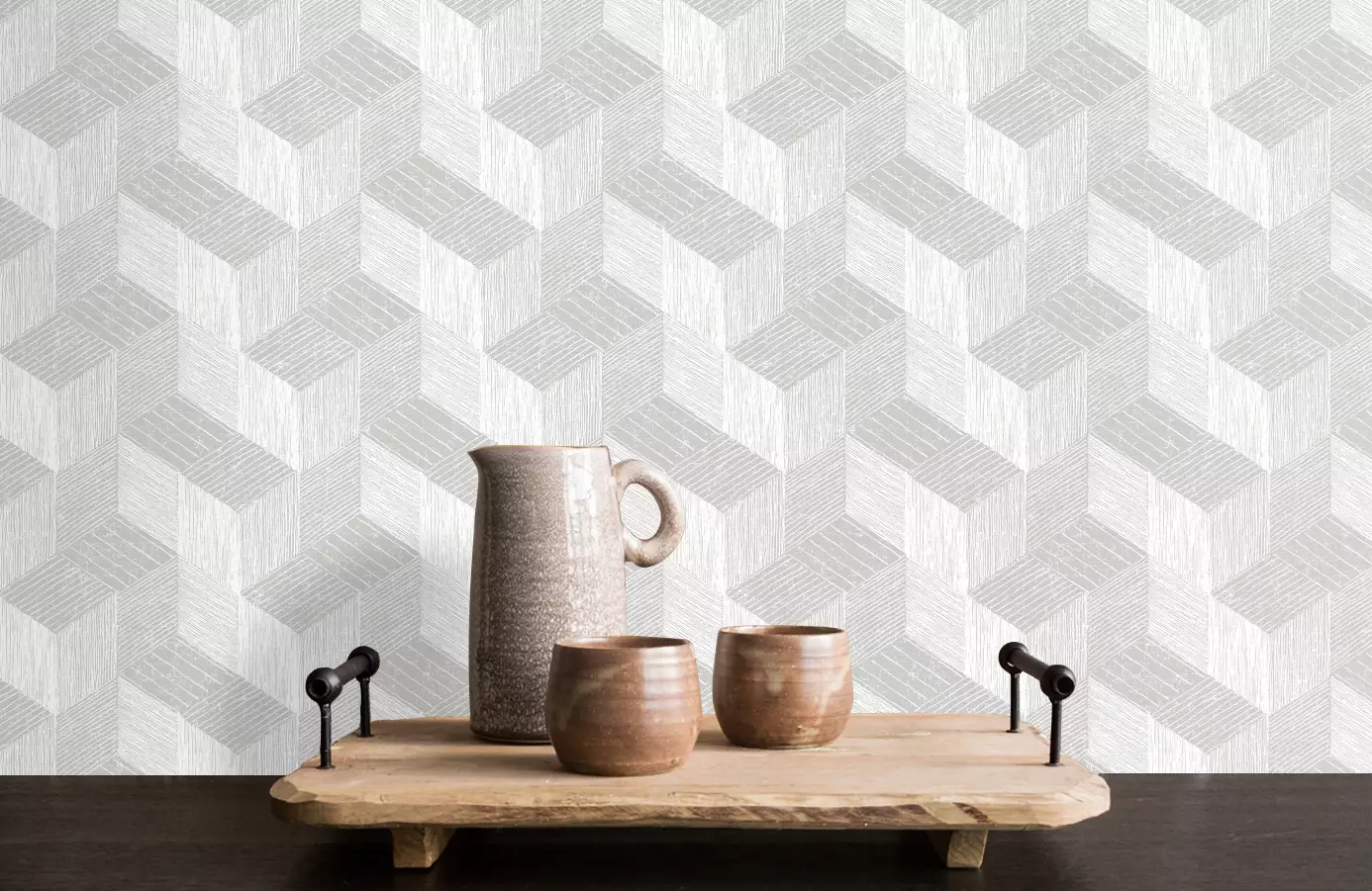The geometric pattern with a 3D spatial effect will bring a new dimension to the interior. Cubes formed by irregular white and gray-silver lines. Non-woven base, vinyl surface.