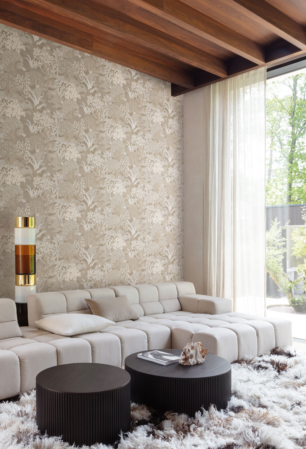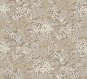 Wallpaper with a nature and wildlife motif in shades of brown and beige, with metallic semi-gloss accents.