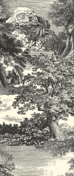 Romantic mural with lightly embossed fabric texture, landscape in shades of grey and black.