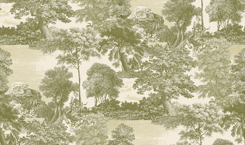 Romantic mural with lightly embossed fabric texture, landscape in shades of green.