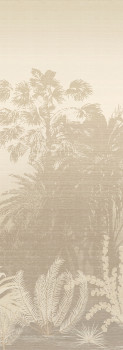 Mural with lightly embossed fabric texture, tropical landscape with palm trees in grey and beige/sand tones.