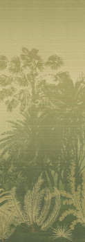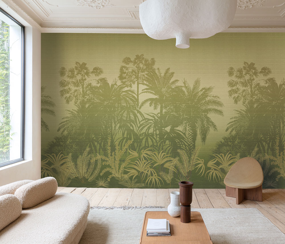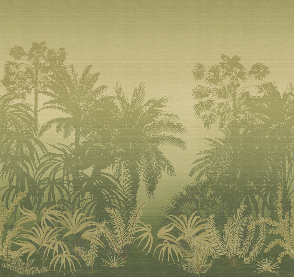 Mural with lightly embossed fabric texture, tropical landscape with palm trees in shades of green.