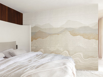 Mural with lightly embossed fabric texture, mountain landscape in shades of grey.