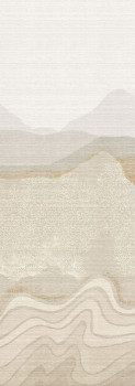 Mural with lightly embossed fabric texture, mountain landscape in shades of grey and beige.